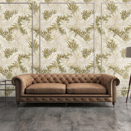 Mẫu 5: Giấy dán tường họa tiết hình lá màu nâu tạo điểm nhấn cho ghế sofa