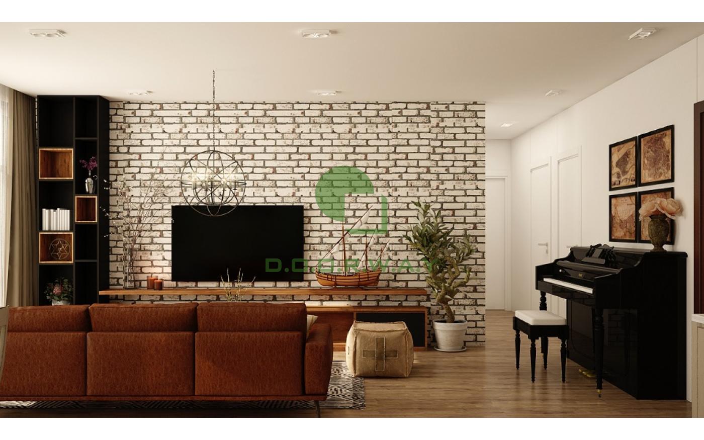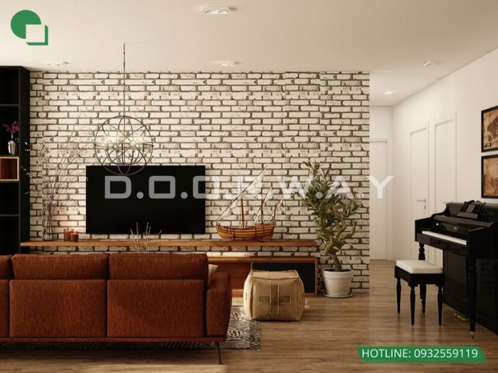 Mẫu phòng khách dùng giấy dán tường hình viên gạch khá phổ biến và quen thuộc, thường được sử dụng như một vật trang trí sinh động cho phòng khách.