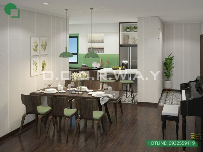 Màu xanh rêu nhẹ nhàng của mẫu giấy dán tường trơn này tạo không khí ấm cúng và liền mạch cho toàn bộ mẫu phòng khách liên thông nhà bếp.