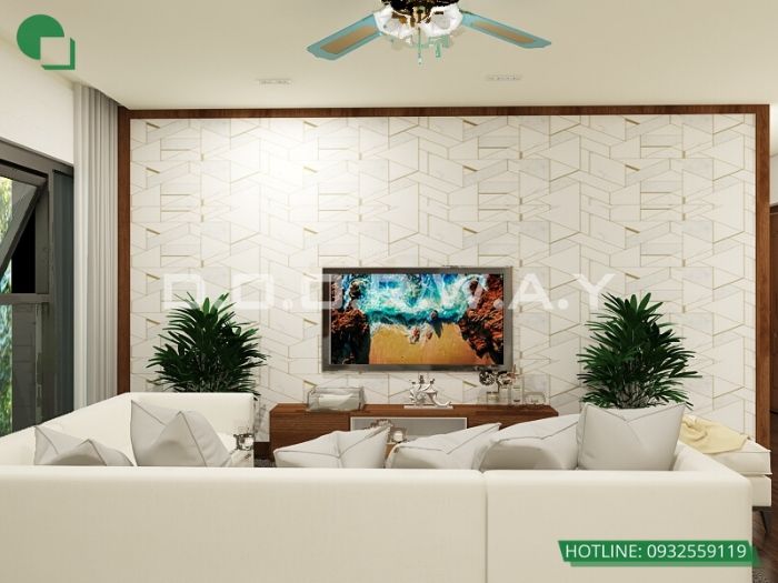 Mẫu phòng khách dùng giấy dán tường chất liệu cao cấp, thiết kế đơn giản, phù hợp với những căn nhà có diện tích nhỏ. Mẫu giấy dán tường này không thấm nước, dễ lau chùi và vệ sinh, có hạn sử dụng đến hơn 5 năm.
